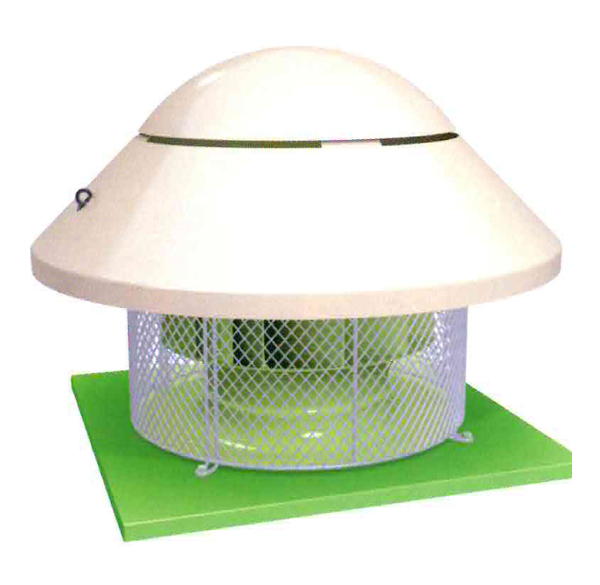 Torrino con girante centrifuga ad alto rendimento con girante a pale rovescie. Tettuccio in vetroresina. Base per ancoraggio a tetto.