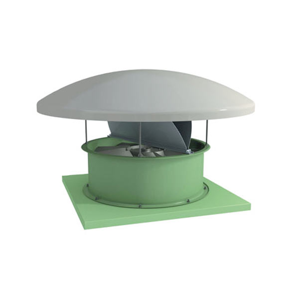 Torrino con girante centrifuga ad alto rendimento con girante a pale rovescie. Tettuccio in vetroresina. Base per ancoraggio a tetto.